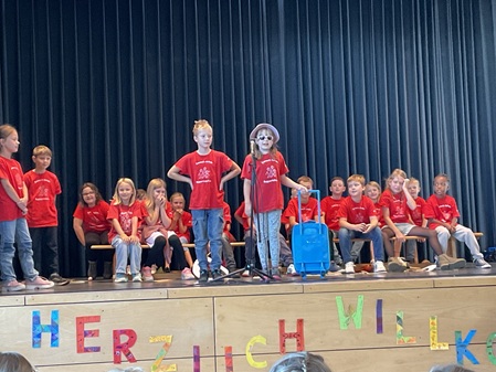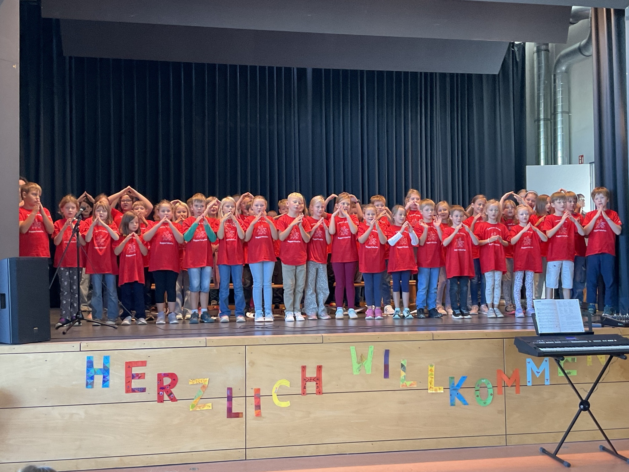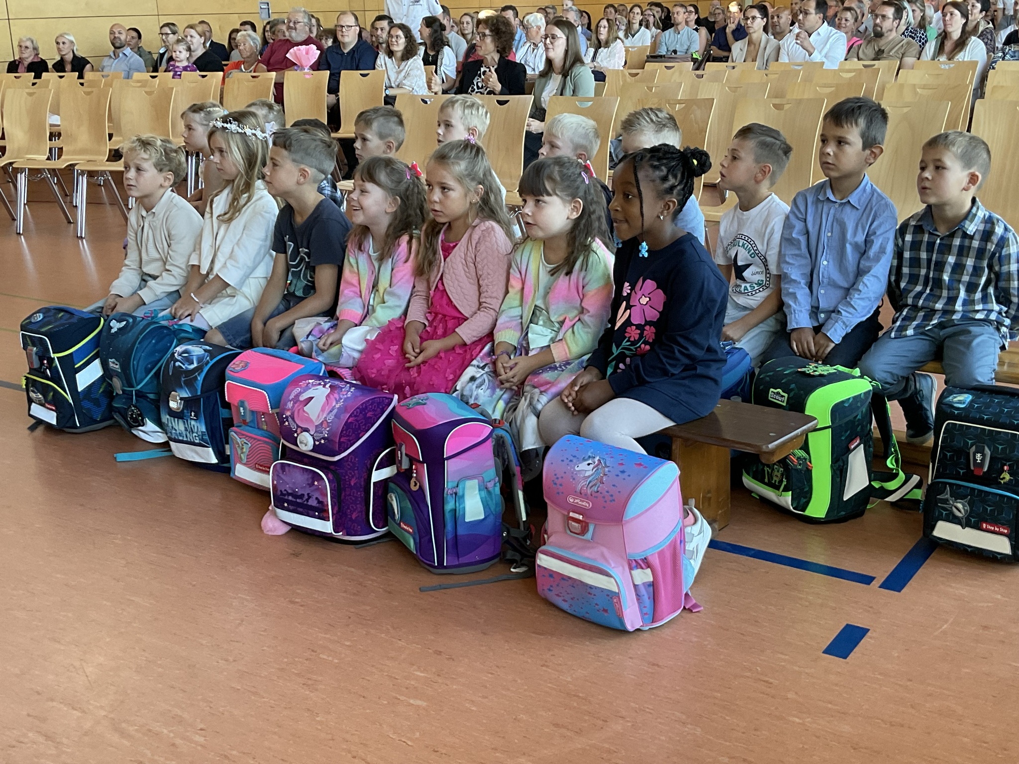 Nach dem Einschulungsgottesdienst in der Stephanuskirche Tonolzbronn fand die Einschulungsfeier im Kultur- und Sportzentrum Jägerfeld statt und begann mit dem gemeinsamen Singen des Liedes „Hip, hop, die Schule ist topp“ durch alle Klassen.