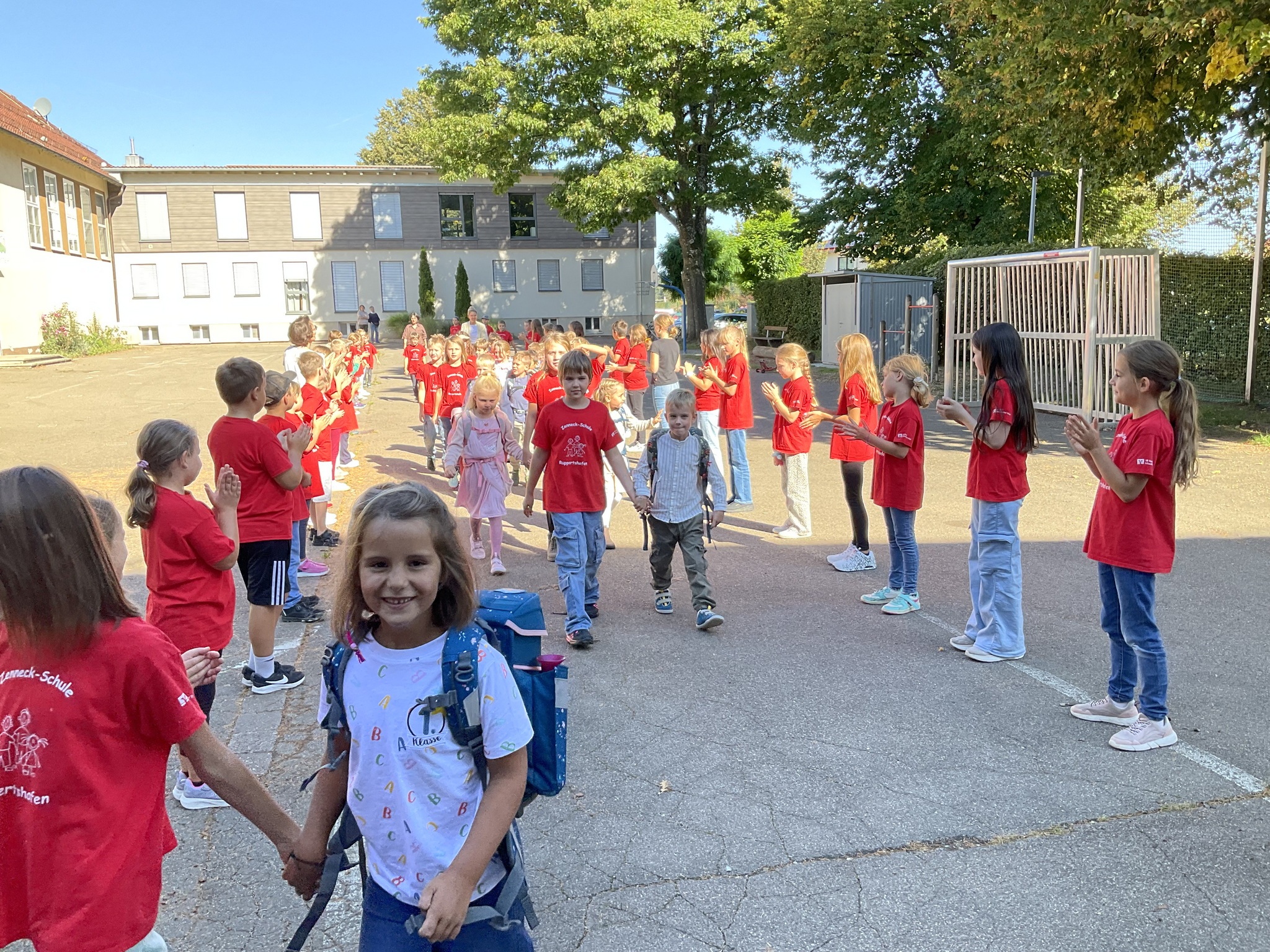 Nach den Begrüßungsworten von Bürgermeister Herr Kühnl, der den Erstklässlern ebenfalls seine besten Wünsche mit auf den Weg gab, begleiteten die Paten aus der dritten Klasse die Schulanfänger und ihre Klassenlehrerinnen Frau Frei und Frau Müller zum Schulhof, wo sie von den anderen Kindern mit einem Spalier freudig empfangen wurden.