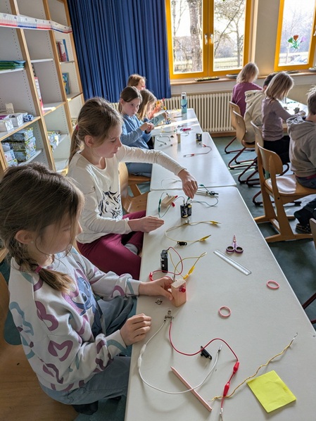 Die Klassen 3 und 4 widmeten sich dem Thema „Strom“. Mit großem Interesse bauten die Schülerinnen und Schüler einfache Stromkreise, untersuchten die Stromleitfähigkeit verschiedener Materialien und lernten den Unterschied zwischen Reihen- und Parallelschaltung kennen. Durch eigenes Experimentieren wurden auch hier naturwissenschaftliche Zusammenhänge anschaulich und verständlich.