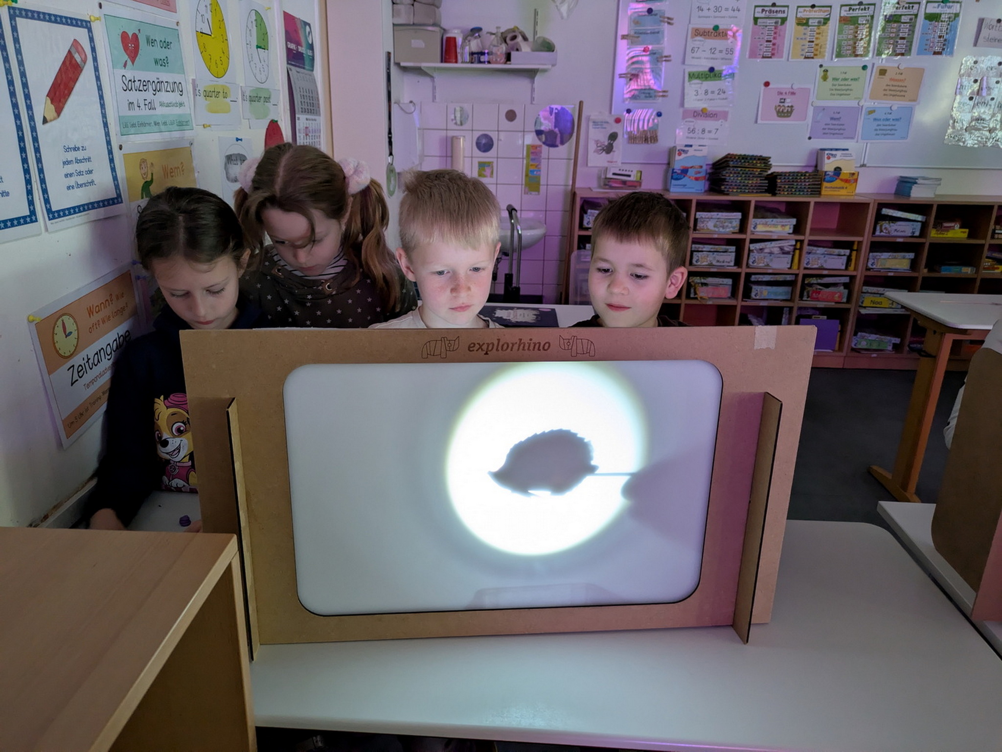 Die Klassen 1 beschäftigten sich mit dem Thema „Licht und Schatten“. Von bunten Schatten bis zur Lochkamera gingen die Kinder forschend der Frage nach: Was ist ein Schatten – und kann er bunt sein? Dabei entdeckten sie, dass sich Licht geradlinig ausbreitet und wie sich Schatten je nach Lichtquelle verändern. Außerdem erfuhren sie die Unterschiede zwischen additiver und subtraktiver Farbmischung und fanden heraus, welche Farben tatsächlich im Licht stecken. Mit viel Neugier und Begeisterung wurde ausprobiert, beobachtet und gestaunt.