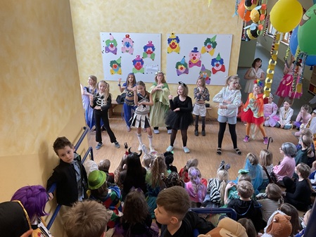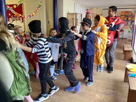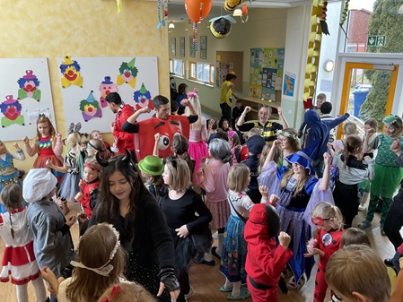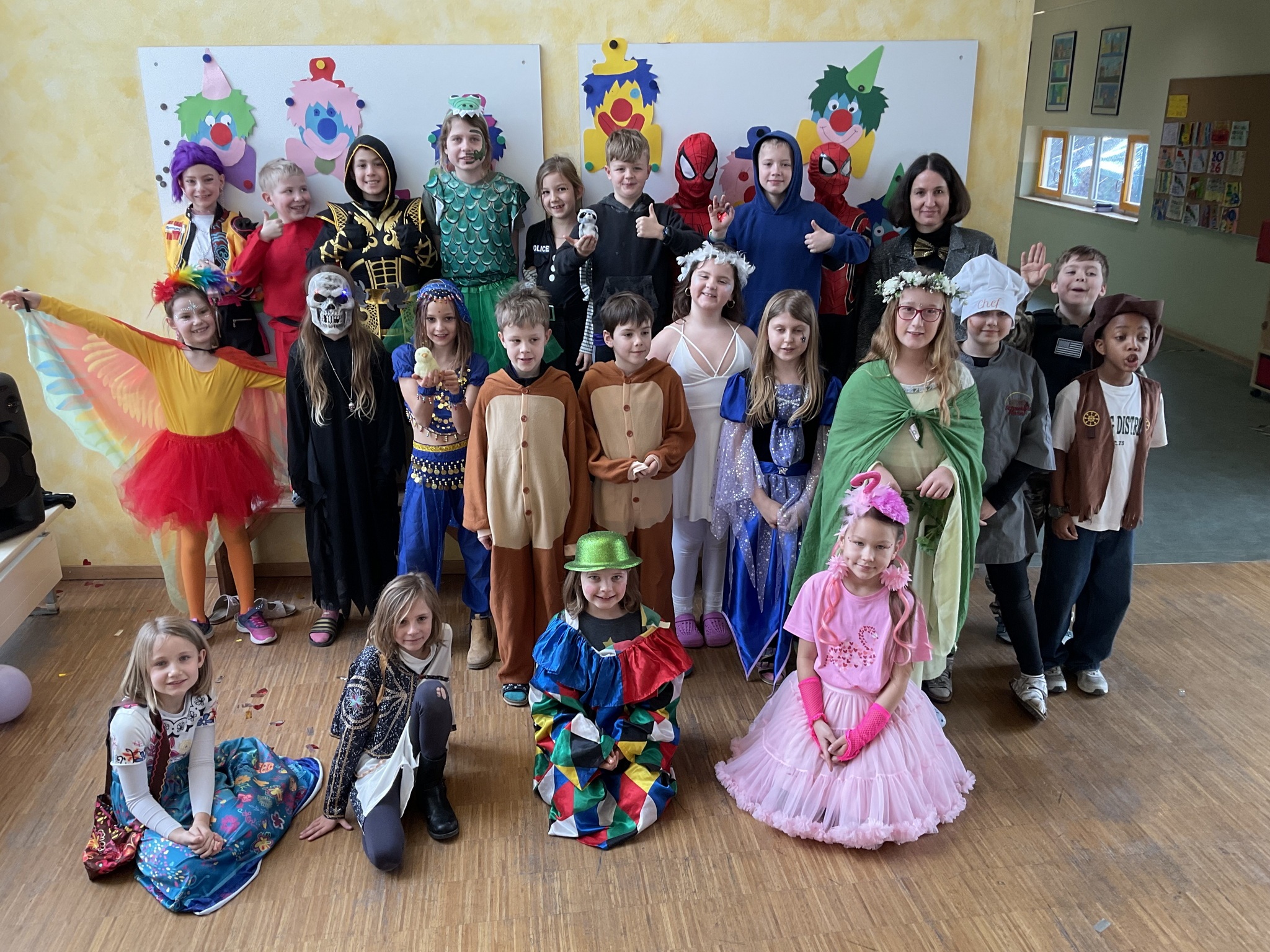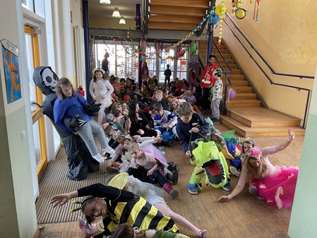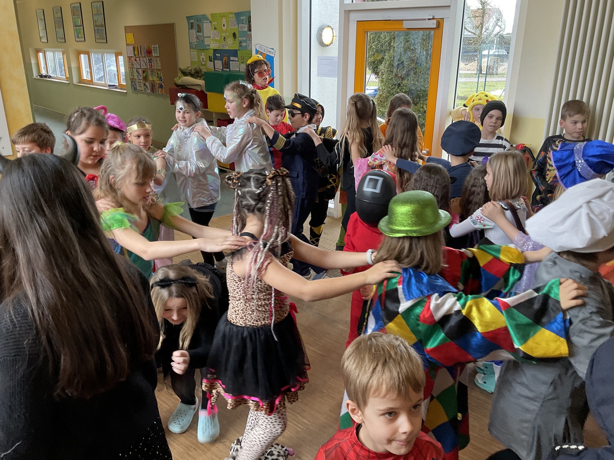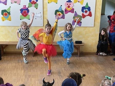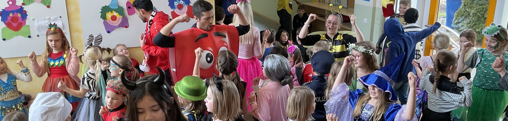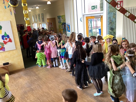 Am Freitag, den 13. Februar, fand in unserer Grundschule eine fröhliche Faschingsparty statt. Schon am Morgen kamen alle Kinder bunt verkleidet in die Schule. Man konnte Prinzessinnen, Omas, Polizisten, Lehrer, Superhelden und sogar Tiere entdecken. Die Kostüme waren sehr kreativ und farbenfroh.