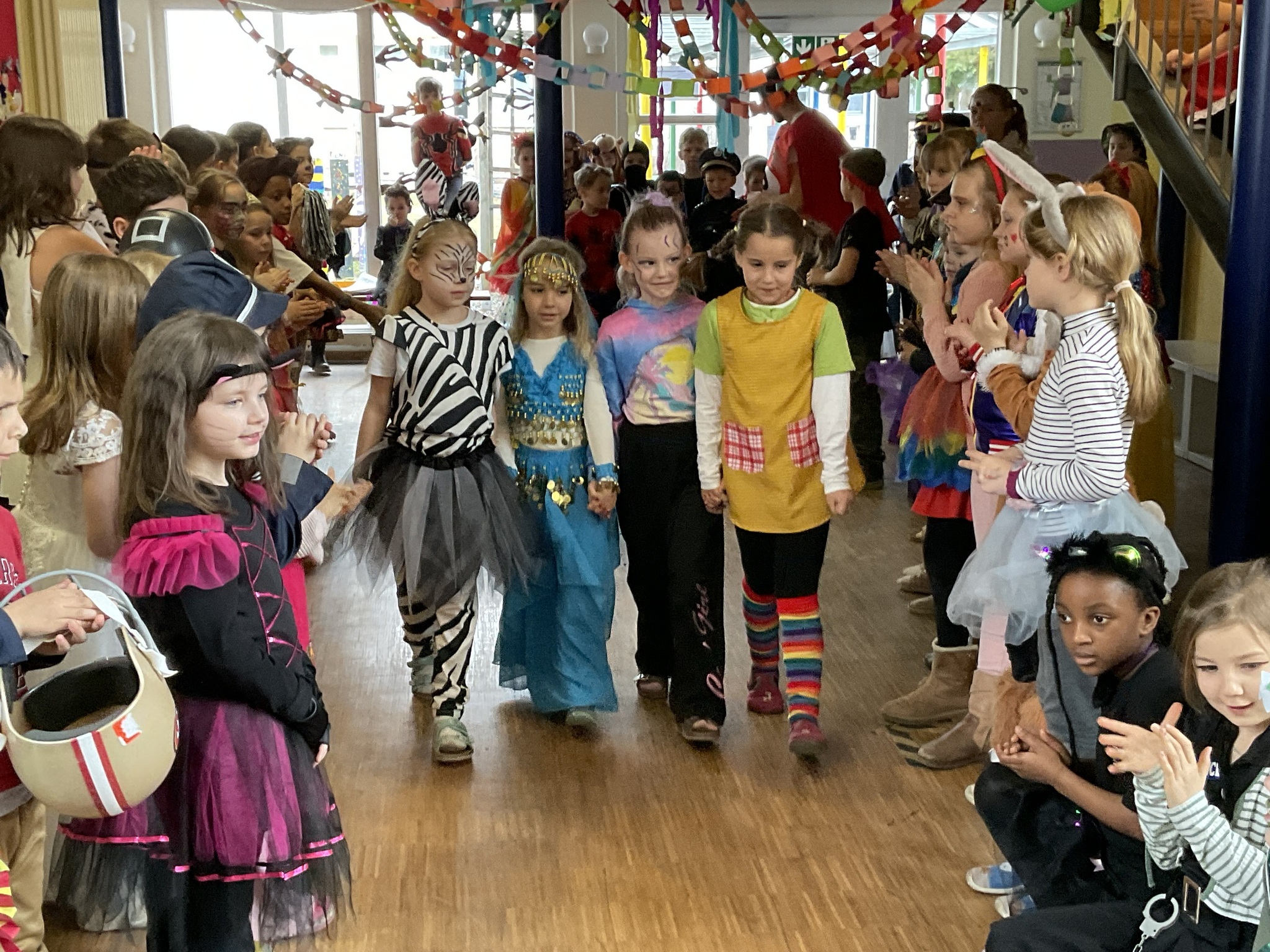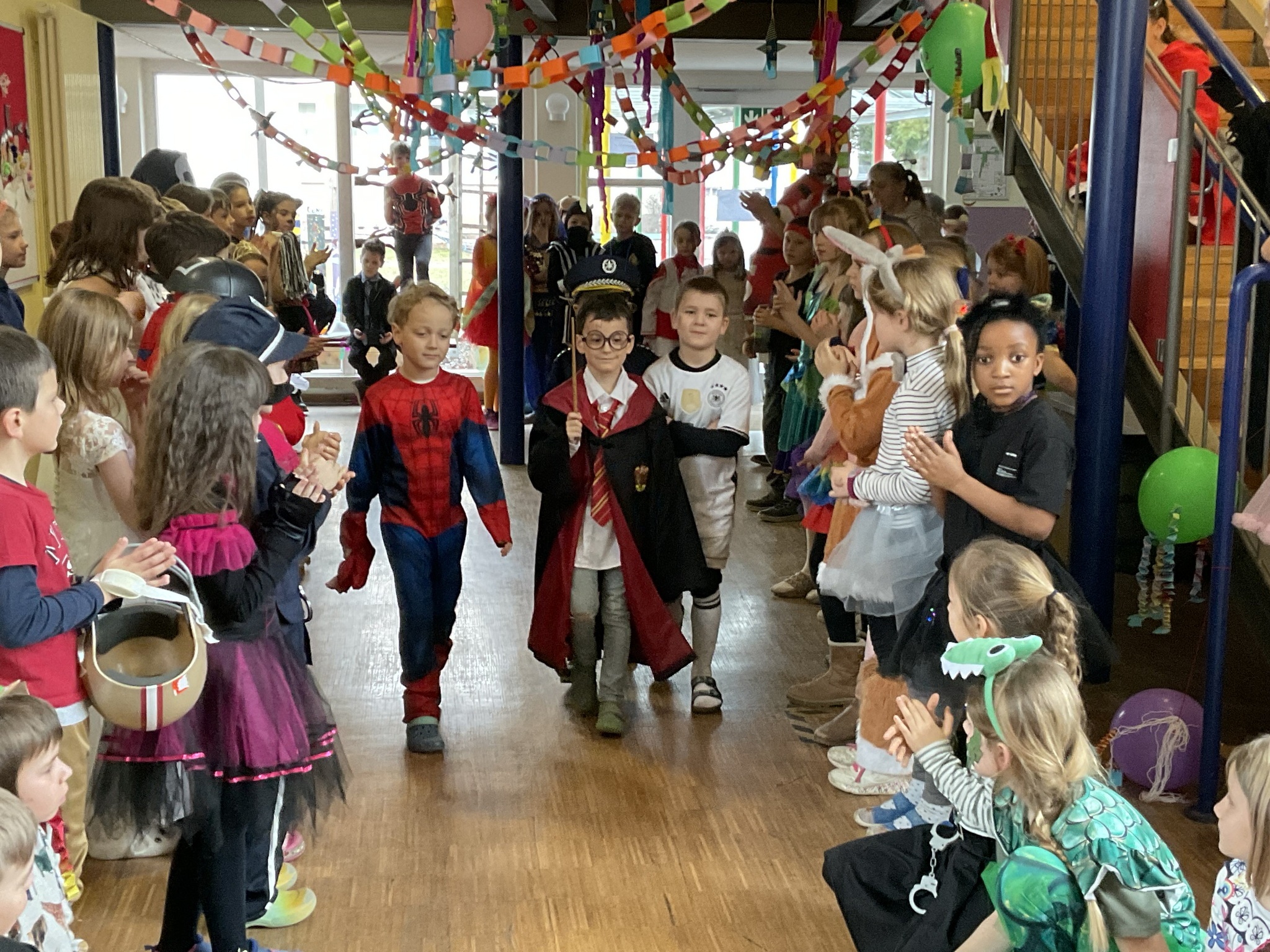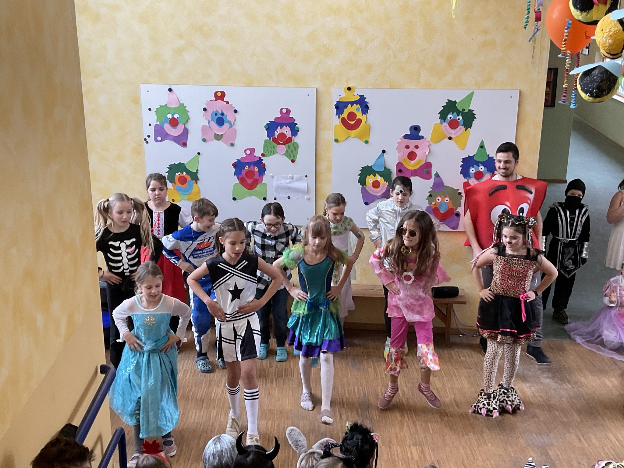 In der Aula war alles festlich geschmückt. Luftballons und Girlanden hingen von der Decke, und fröhliche Musik sorgte für gute Stimmung. Gemeinsam tanzten wir zu bekannten Liedern wie „Der Zug hat keine Bremse“ oder dem „Bobfahrerlied“ und machten eine Polonaise durch das ganze Schulhaus. Zahlreiche Tänze der Tanzgruppen heizten die Stimmung an.