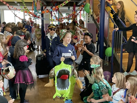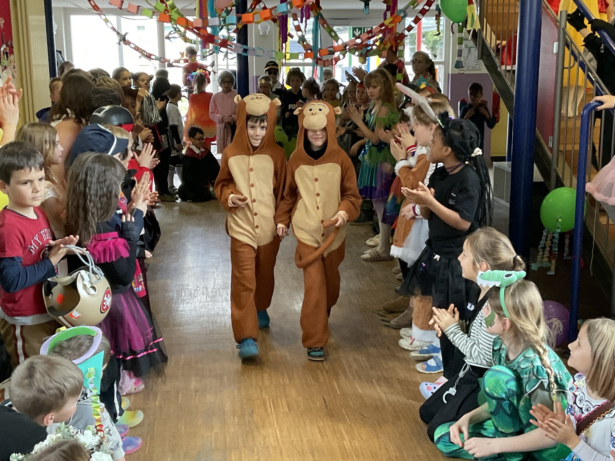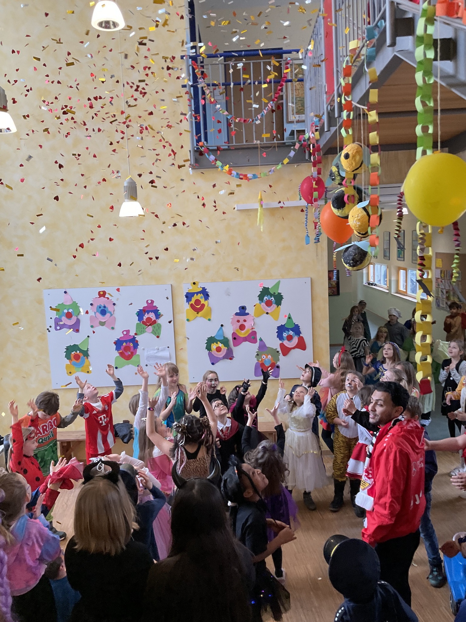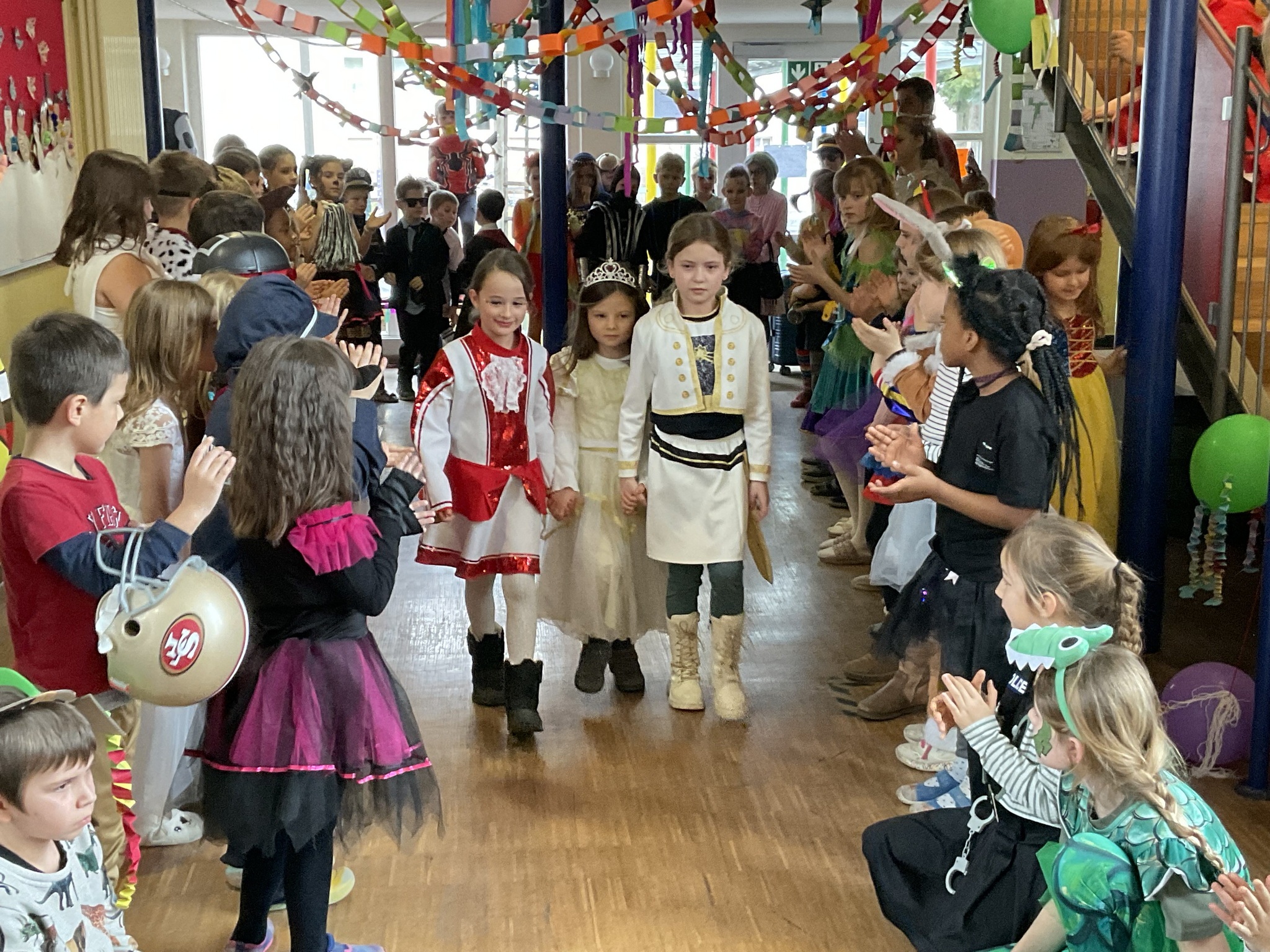 In der Aula war alles festlich geschmückt. Luftballons und Girlanden hingen von der Decke, und fröhliche Musik sorgte für gute Stimmung. Gemeinsam tanzten wir zu bekannten Liedern wie „Der Zug hat keine Bremse“ oder dem „Bobfahrerlied“ und machten eine Polonaise durch das ganze Schulhaus. Zahlreiche Tänze der Tanzgruppen heizten die Stimmung an.