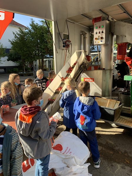 Unser Dank gilt hier den zahlreichen Apfel-Spendern und der Kreissparkasse Ostalb, die diese Aktion finanzierte! Fasziniert sahen die Schülerinnen und Schüler zu, wie aus den Äpfeln Saft gemacht und abgefüllt wurde. Natürlich gab es für jeden gleich die Möglichkeit den süßen Genuss zu versuchen.