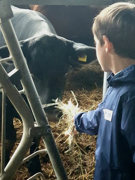 So durften die Jungen und Mädchen junge Rinder beobachten und mit Heu füttern. Außerdem wurde am Hofhund Simba die Unterscheidung zwischen Haus- und Nutztier besprochen. Simba freute sich sehr über das Suchspiel, bei dem die Kinder Leckerli für ihn versteckten und er auf Kommando diese suchen (und natürlich fressen) durfte.
