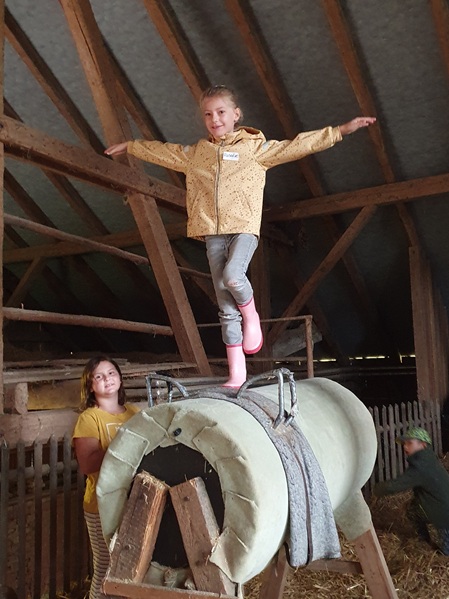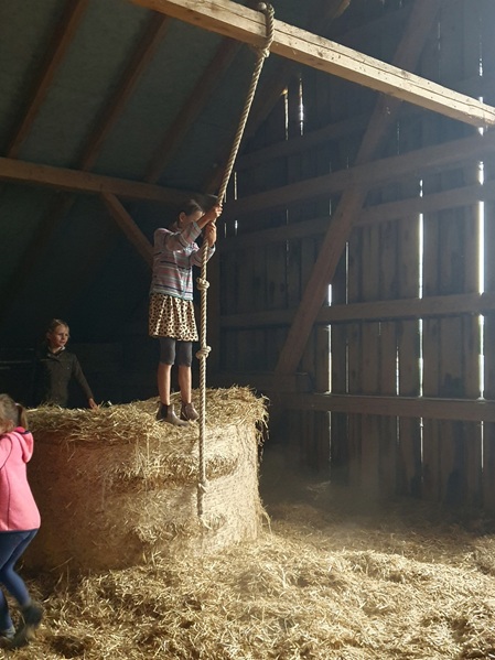 Da es an diesem Tag sehr regnerisch war, war die Bewegungspause in der Scheune ein besonderes Highlight. Hier durften sich die Kinder mit viel Schwung ins Stroh fallen lassen oder konnten auf einem Holzpferd turnen.