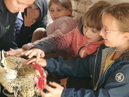 Auch die Hühner wurden besucht und die Kinder erfuhren viel Spannendes über diese Tierart. Besonders mutige Schüler durften den Hahn im Anschluss auf den Schoß nehmen und streicheln, was sich dieser überraschenderweise gut gefallen ließ.