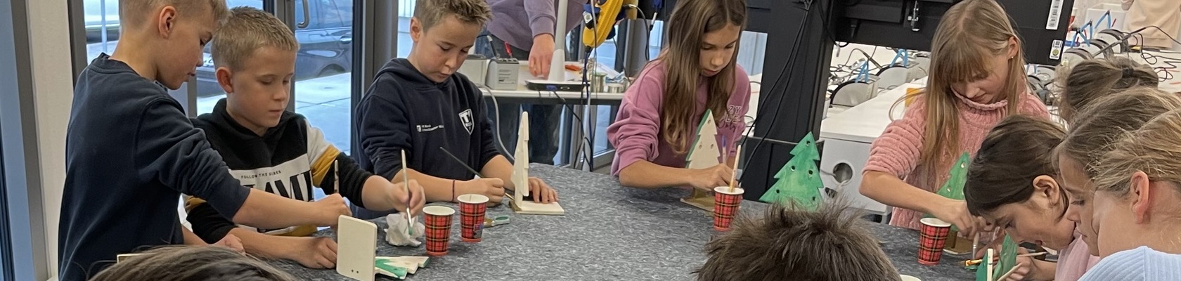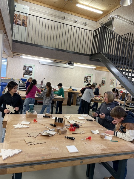 Dort in der Werkstatt durften die Kinder ihr Holz sägen, bohren, schleifen und schrauben. Dann wurde es noch angemalt. Etwas knifflig war es dann, die Drähte an die kleinen Lampenfassungen festzumachen. Als das geschafft war, wurden zum Schluss alle Drähte noch festgelötet und kleine Glühbirnen eingeschraubt.