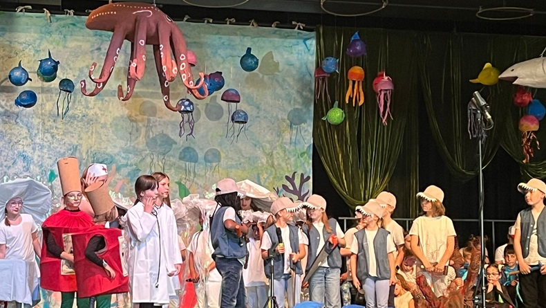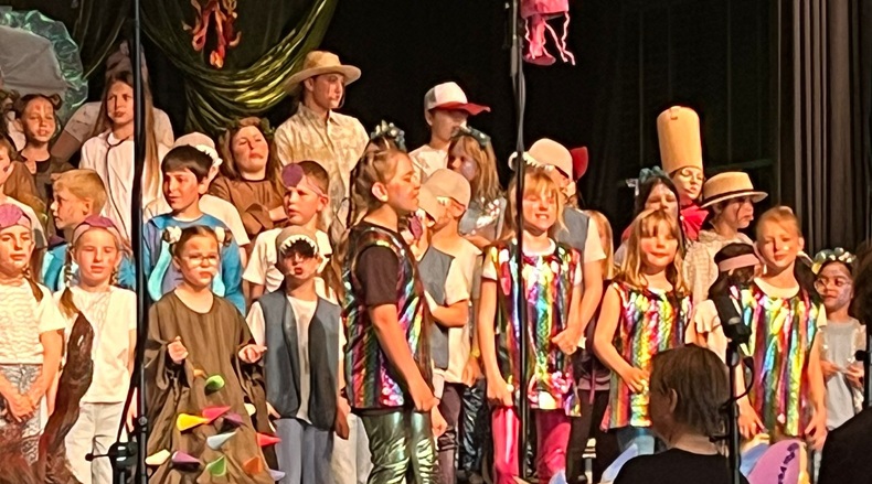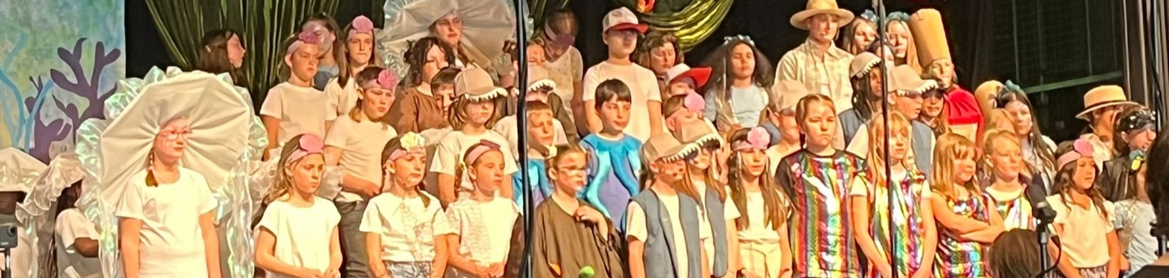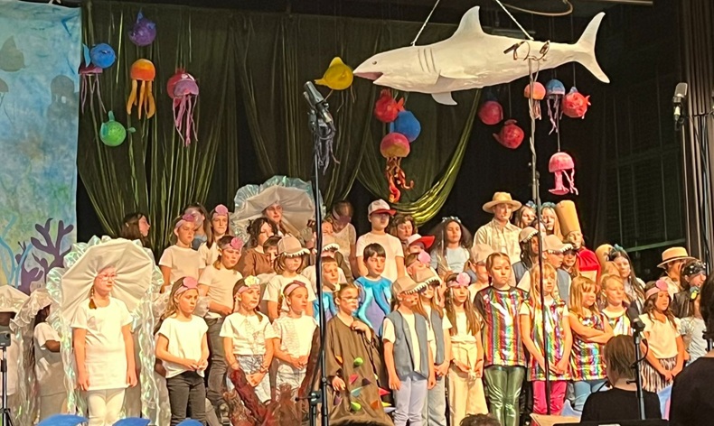 Eine turbulente Unterwasserwelt erlebten die Konzertbesucher des Musicals „Im Riff geht’s rund“, das anlässlich des 50jährigen Bestehens der Musikschule Schwäbischer Wald/Limpurger Land in Murrhardt aufgeführt wurde. Unter der Leitung von Larissa Schneider wirkten auch Kinder der Zenneck-Schule aus Ruppertshofen und der „Ruppertshofener Singvögel“ vom Gesangverein Ruppertshofen mit. Begeistert sangen, spielten und tanzten farbenfrohe Papageienfische, „dralle Quallen“, Muränen-, Tinten-, Doktor- und Kugelfische, aber auch grimmige „Zerstörer-Raubfische“ auf der Bühne. Es galt, einen Vulkanausbruch zu verhindern, was Dank der Hammerhaie auch gelang. Freche Sprüche und ein raffinierter Musikstilmix aus Jazz, Rock und Pop waren Garantie für eine vergnüglichen und pfiffigen Nachmittag bester Unterhaltung.